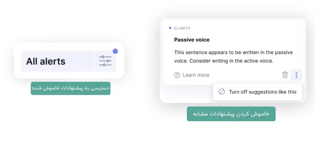 توجه: دقت کنید که اگر نوع خاصی از پیشنهاد را در Grammarly Editor غیرفعال کنید، در سایر برنامه های Grammarly ، مثل نسخه موبایل یا افزونه های word یا chrome نیز غیرفعال خواهد شد.