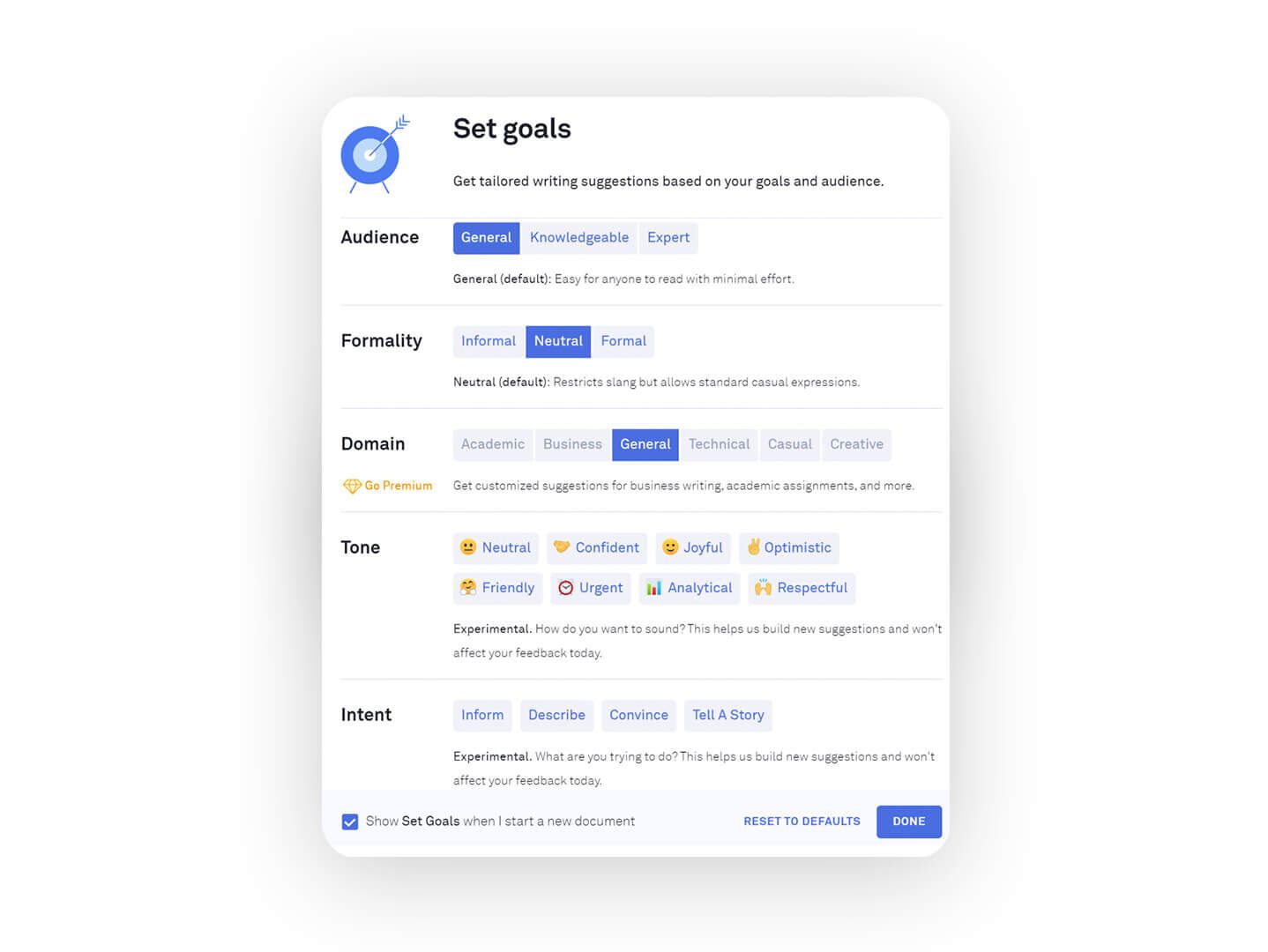 برای تنظیم هدف خود، روی Goals در پنل سمت راست کلیک کنید، تنظیمات دلخواه خود را انتخاب کنید و روی Done کلیک کنید.