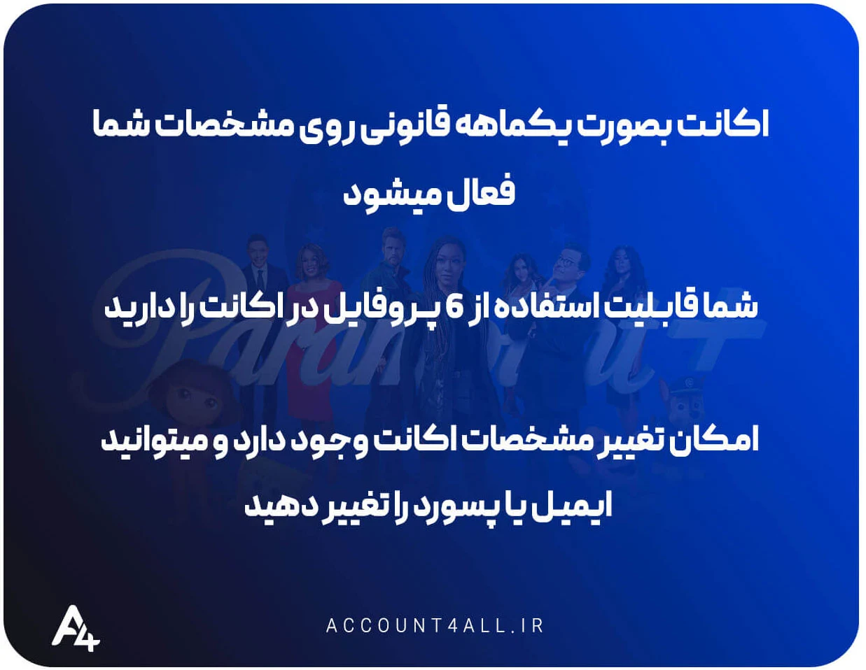 - اکانت در نسخه اصلی برنامه Paramount plus یا وبسایت پارامونت پلاس قابل استفاده است.