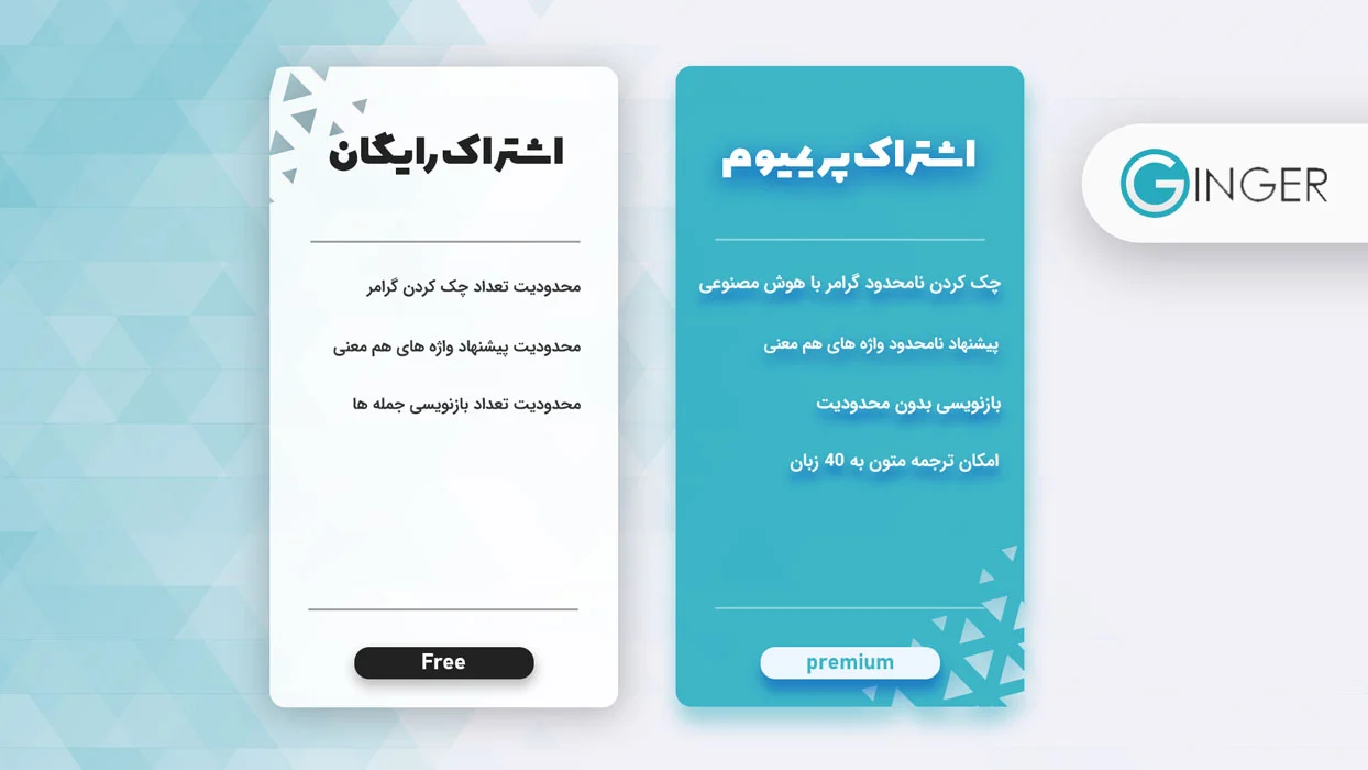 نسخه رایگان اشراک Ginger بسیار محدود است. در نسخه رایگان تنها به ترجمه، معنی لغات، اصلاح متن اما به صورت محدود و پلاگین Chrome دسترسی دارید. در واقع اکثر ویژگی هایی که پیشتر گفته شد تنها در اکانت پرمیوم Ginger موجود است. با خرید اکانت پرمیوم Ginger می توانید به تمامی ویژگی های آن دسترسی پیدا کنید. تفاوت های آنها در تصویر زیر مشهود است.